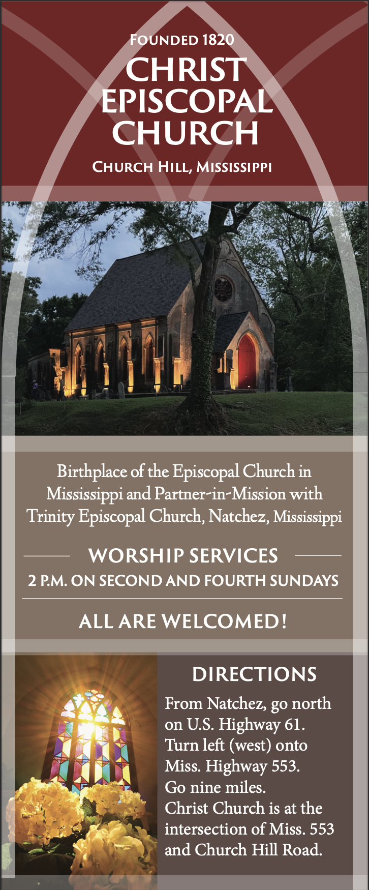 Christ Church was the first Episcopal congregation founded in the State of Mississippi in 1820, and and the current church building, built in 1857-1858, is a national landmark.